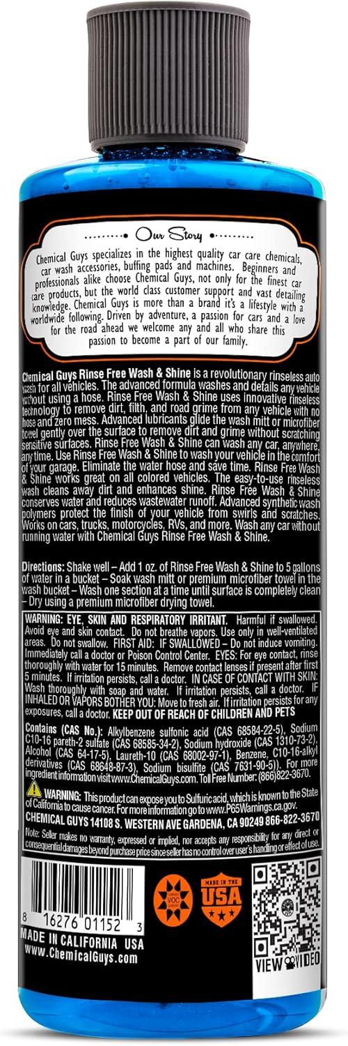Rinse-Free Wash & Shine uses rinse-less technology to safely remove dirt, filth, and road grime from any vehicle with no hose and no mess. The new formula uses next-generation lubricants and emulsifiers to wash a car without any running water or hose. Slick synthetic lubricants glide the premium wash mitt or microfiber towel gently over the surface to remove dirt and grime without scratching sensitive parts. Wash any car, anywhere, any time with Rinse Free Wash & Shine; use the hose-less car wash technology to clean any vehicle in the warmth of the garage on a cold winter's night, or outside under a shady tree on a bright spring day.