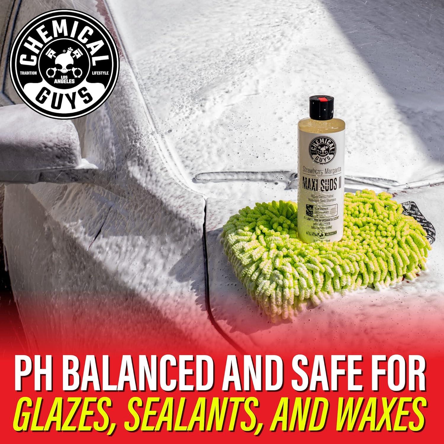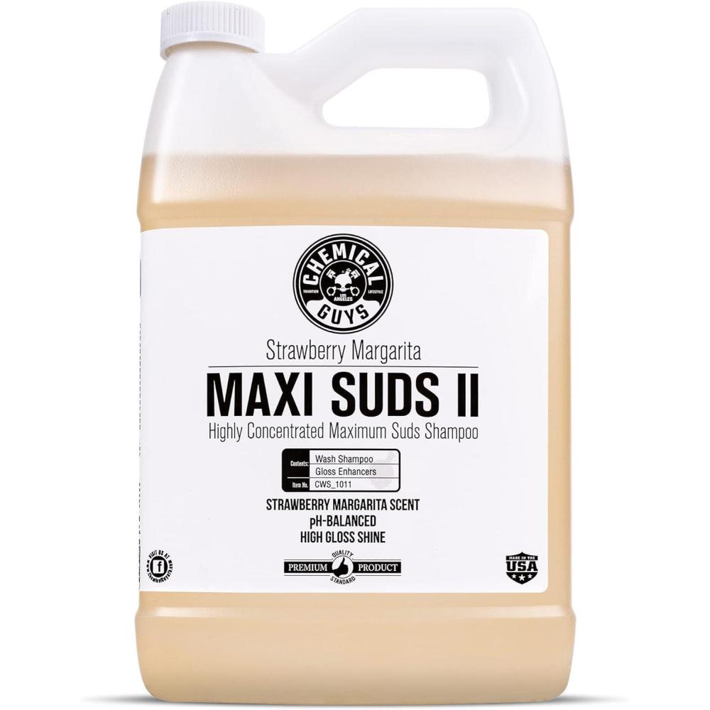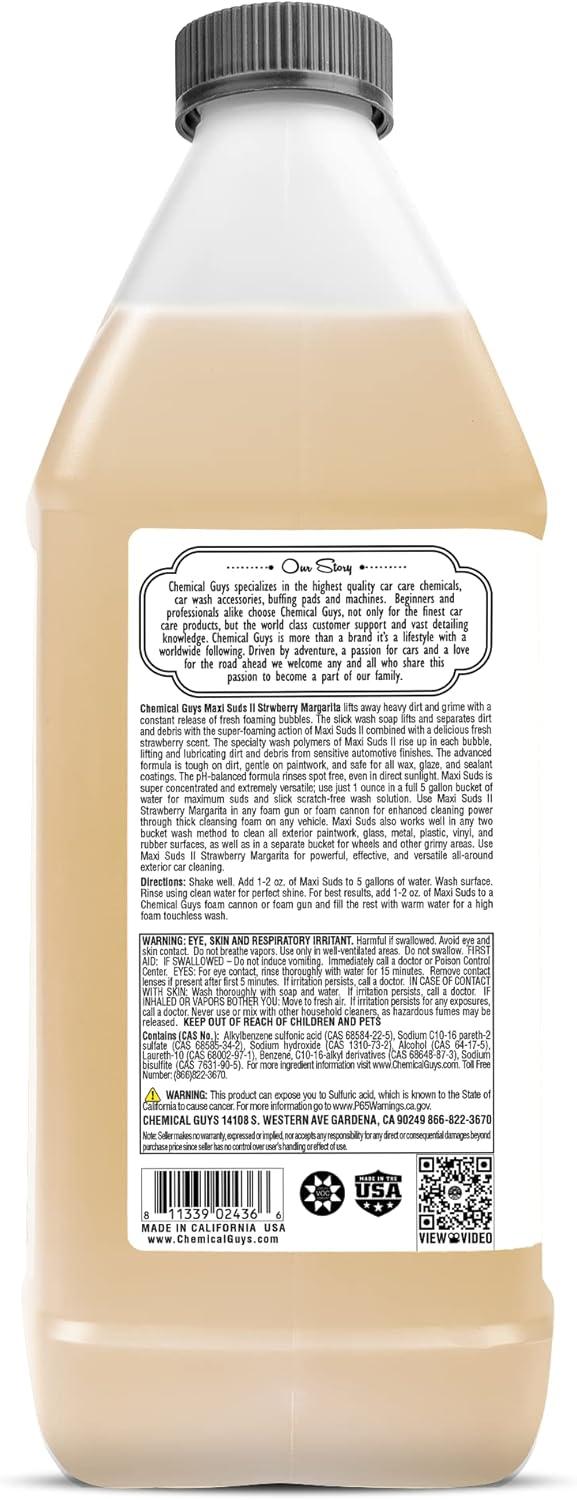 Maxi Suds II Strawberry Margarita Soap lifts away heavy dirt and grime with a constant release of fresh foaming bubbles. The slick wash soap lifts and separates dirt and debris with the super-foaming action of Maxi Suds II Strawberry Margarita Soap combined with a delicious fresh strawberry scent. The specialty wash polymers of Maxi Suds II rise up in each bubble, lifting and lubricating dirt and debris from sensitive automotive finishes. The advanced formula is tough on dirt, gentle on paintwork, and safe for all wax, glaze, and sealant coatings. The pH-balanced formula rinses spot free, even in direct sunlight. Use Maxi Suds II Strawberry Margarita in any foam gun or foam cannon for enhanced cleaning with thick foam on any vehicle.